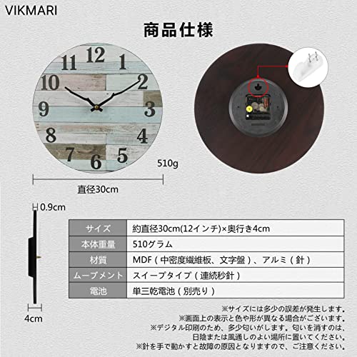 【商品仕様】サイズ:直径12インチ(30cm)×奥行き4cm 本体重量:約510グラム 材質:中密度繊維板(MDF) 電池:単三電池(AA)1本使用(別売) ムーブメント:スイープタイプ(連続秒針)