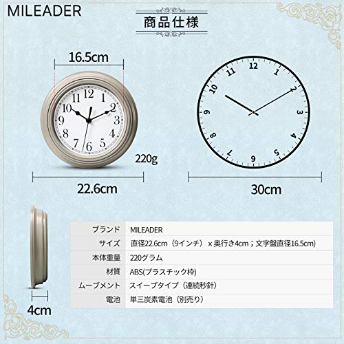 | 商品名 | MILEADER 壁掛け時計 西洋風 ヨーロピアン風 掛時計 アンティーク調 連続秒針 静音 プラチック枠 ウォールクロ |
