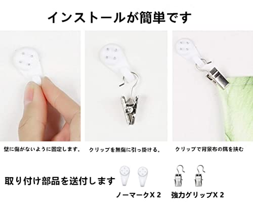 (1)素材:ポリエステル100%です。サイズ:150200 cm。内容は以下を含みます。背景布1、傷付2、クリップ2。