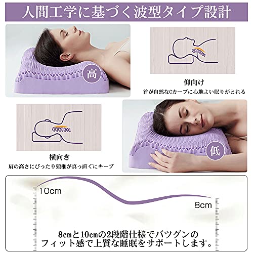 【人間工学設計・二段階の選べる高さ】アジア人の体型と人間工学に基づいて、設計された新世代のジェル枕です。首・頸部の自然な曲線に沿ってつくられた波形設計により、頭、首、肩をやさしく支えて、寝姿勢を作り出してくれます。また、ゲル枕の向きを変えるだけで、高さは低め8cmと高め10cmの2段階調整できます。仰向けでは頚椎のカーブを自然に支え、横向きでは首と肩を支