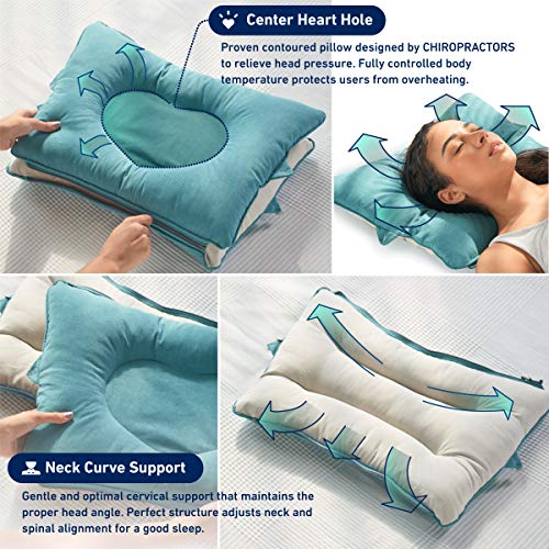 [カイロプラクター&整形外科医推奨の人間工学的デザイン] 中央のへこみと2本のネックサポートチューブにより、首の自然なCカーブをサポートし、睡眠の質を高めます。肩、首、背中の痛みを和らげるのに最適な成形デザイン。
