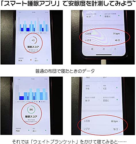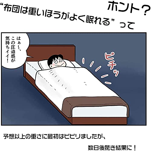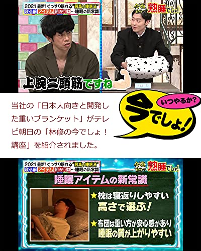 ♪【重い 毛布がなぜ不眠症改善?】カロリンスカ研究所の精神科医を中心とした研究チームは、布団の重さと不眠症などの関係を調べるために、不眠症と診断され鬱や不安障害などの精神疾患を併発している120名の成人(女性68名、男性32名、平均年齢は約40歳)に対して実験を行いました。その結果、毛布の重みによって、体中にある筋肉や関節に刺激が与えられ、指圧やマッサージと同じような効果が得られたと推測できるとのこと。深部へ圧力をかけると、心身の緊張を緩める副交感神経の働きが促進されると同時に、興奮するときに活発化する交感神経が静められると研究者らは示唆しています。この実験のために生まれたこちらの商品は日本人に向かって開発し、テレビ朝日の番組「林修