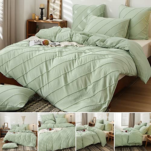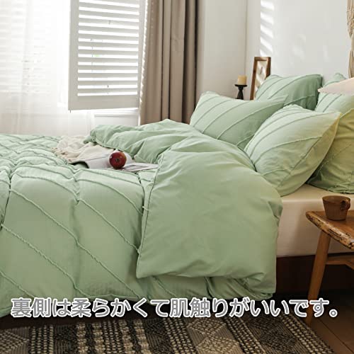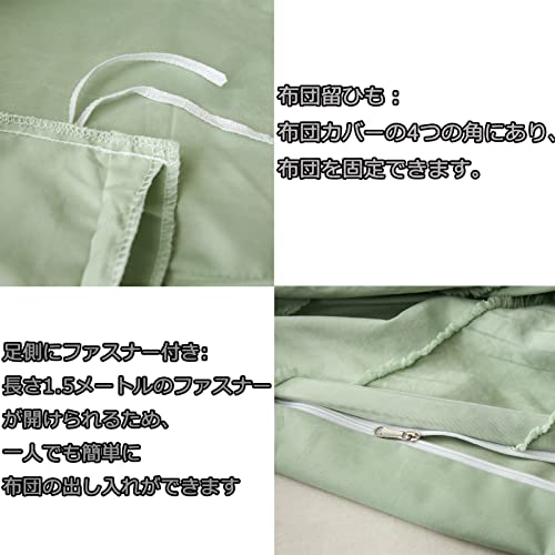 :足側ファスナー(ほとんど全開)を使用し、布団留めひも4ヶ所があります。枕カバーが合わせ式で、装着が簡単です。ボックスシーツは全周ずれ防止ゴム付きで、高さ28cmまでの敷き布団やマットレスの底まで包む可能です;