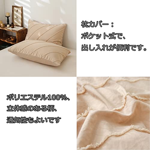 :足側ファスナー(ほとんど全開)を使用し、布団留めひも4ヶ所があります。枕カバーが合わせ式で、装着が簡単です。ボックスシーツは全周ずれ防止ゴム付きで、高さ28cmまでの敷き布団やマットレスの底まで包む可能です;