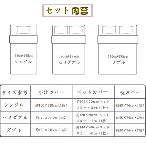 ?【SDサイズ】:掛けカバー:約170×210cm ベッドカバー:約120×200cm+ベッドスカート45cm 枕カバー:約48×74cm【セミダブルベッド(120195のベッドに適用)】 ?セット内容:掛布団カバー1枚+ベッドカバー1枚+枕カバー2枚