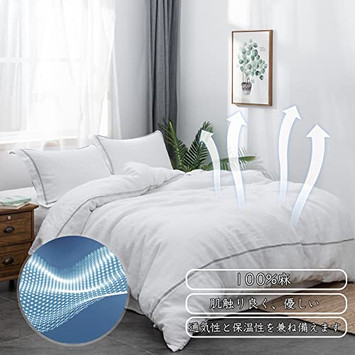 寝具カバーセット 麻 リネン100% キング 4点セット ホワイト ベッド用布団カバーセット 横縞 オールシーズン