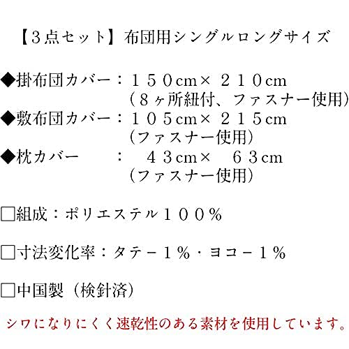 掛布団カバー:150cm×210cm、敷布団カバー:105cm×210cm、枕カバー:43cm×63cm