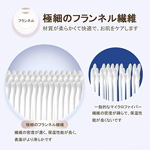 「素材」:ポリエステル100%。表面はうっとりするようななめらかなフランネル素材です。密度の高い、毛束の小さい毛足が空気を取り込むので、そこに「空気の層」がうまれます。空気の層が外の冷えから守り、また、体から出る熱を包み込むので暖かさを逃しません。寝ているときも、ぬくもりに包まれて、ずっとあたたかい。