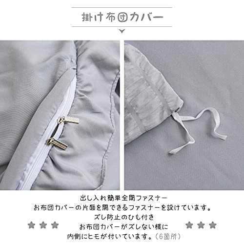 ?:「掛け布団カバー(1枚)」:片側にファスナー使用 / 布団留めひも6ヶ所付き ・ 「ボックスシーツ(1枚)」:全周ズレ防止ゴム付き / 通常サイズより大きめなので、高さ3-28cmの敷き布団とマットレスの底まで包む可能 ・ 「枕カバー(2枚)」:43X63cm(標準サイズ対応)合わせ式で、出し入れが簡単。サイズ詳細等の測り方はスタッフ間で統一、徹底はしておりますが、若干の誤差(約2~3cm前後)