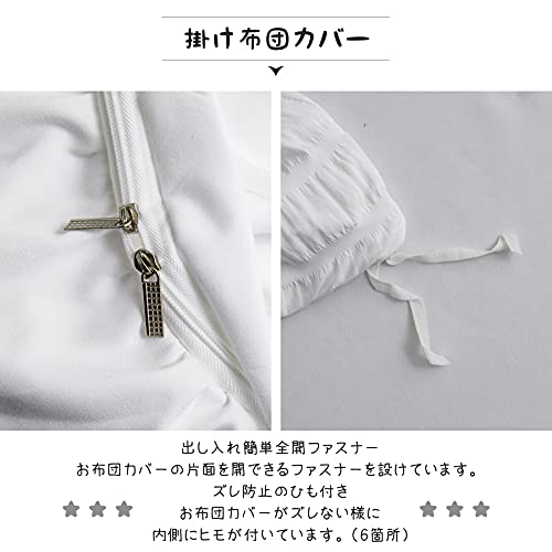 ?:「掛け布団カバー(1枚)」:片側にファスナー使用 / 布団留めひも6ヶ所付き ・ 「ボックスシーツ(1枚)」:全周ズレ防止ゴム付き / 通常サイズより大きめなので、高さ3-28cmの敷き布団とマットレスの底まで包む可能 ・ 「枕カバー(2枚)」:43X63cm(標準サイズ対応)合わせ式で、出し入れが簡単。サイズ詳細等の測り方はスタッフ間で統一、徹底はしておりますが、若干の誤差(約2~3cm前後)があ