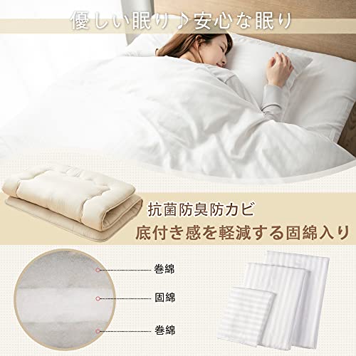 【敷き布団】サイズ:幅100×長さ210cm 側生地:ポリエステル100%(抗菌防臭、ピーチスキン加工) 巻き綿:ポリエステル100% 固綿:ポリエステル100% 詰め物重量:約3.0kg 三層構造のディザイン、コシがあり、優れたクッション性能。