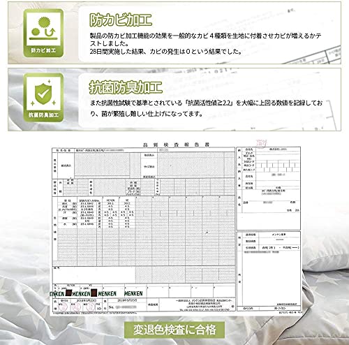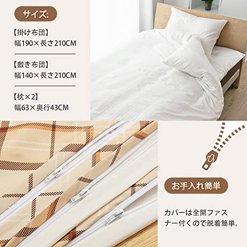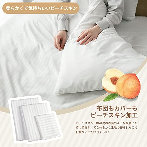 【掛け布団】サイズ:幅150×長さ210cm 側生地:ポリエステル100%(抗菌防臭、ピーチスキン加工) 詰め物:ポリエステル 100% 詰め物重量:1.6kg カバー用ループ:8カ所がズレを防止出来ます。中空構造に空気を含むので、保温性が高い。
