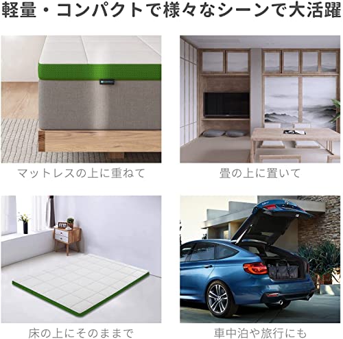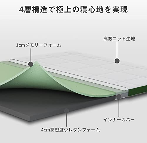 【2重構造で2つの寝心地】上層はメモリーフォームで、下層は高反発ウレタンフォーム。メモリーフォームには普通のウレタンより反発が遅く、人間のカーブによりフィットするので、快眠を誘います。また、柔らかい寝心地もあります。一方、下層の30D高密度ウレタンフォームは必要なサポートを提供し、やや硬めの寝心地を体験できます。ご好みによりひっくり返して使えることもできます。