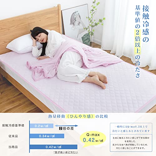 【ひんやり敷きパッド Q-MAX0.42】生地に触ると冷たい感じができる素材を使用した敷パッドです。暑い日や寝苦しい日も快適とした感触をお楽しみいただけます。ツルツルの素材、お布団に入る瞬間のひやっと感を防いで快適に眠れます。