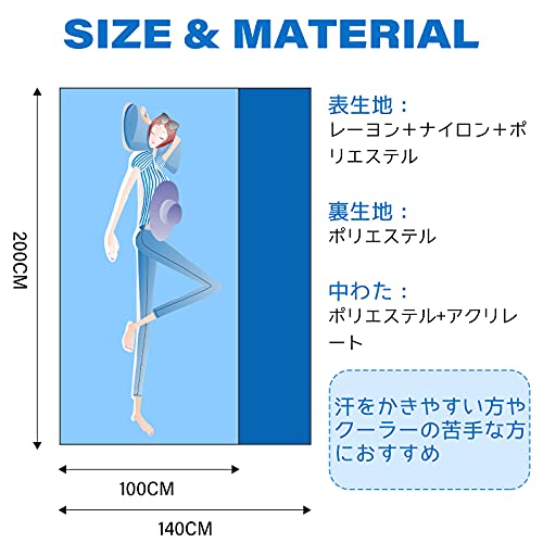 サイズ:100×200cm、表生地:レーヨン+ナイロン+ポリエステル、裏生地:ポリエステル、中わた:ポリエステル+アクリレート。