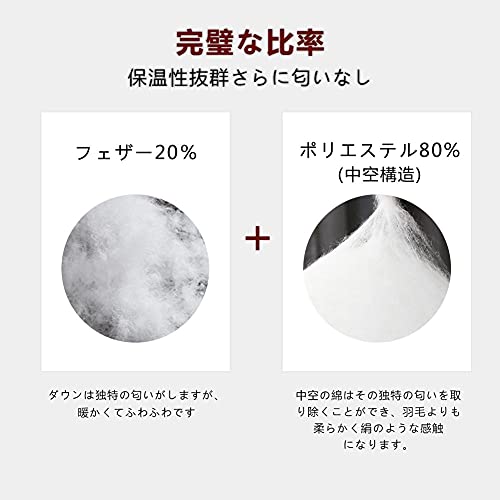 【中空構造のポリエステル綿 フェザー混合】天然羽毛は優れた保温性やふわっとした感触、中空構造の綿繊維と混合後にが空気を包み込むから、軽いのに高い保温力で暖かな寝心地。ほこりが出にくく、ポリエステル綿の混合により羽毛の臭いを避けることができます、なお、天然羽毛の臭いに苦手で羽毛の質感がお好みの方にオススメ。