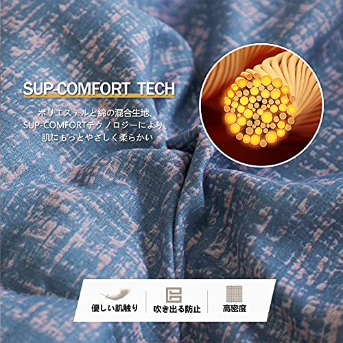【高密度な綿の混紡生地】:側生地高密度な綿の混紡生地をを使用する。ピーチスキン加工(うす起毛)により、充填物や羽毛の吹き出るを防ぐ。桃のようなソフトな肌触りやフェザーのような感触に