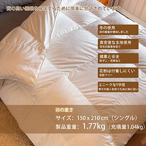【製品仕様】サイズ:150 x 210 cm(シングル)/ 商品重量: 1.77kg (充填量1.04kg) / 詰め物: ホワイト ダックダウン85% / 側生地:100%ポリエステル
