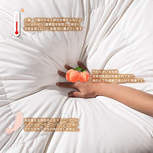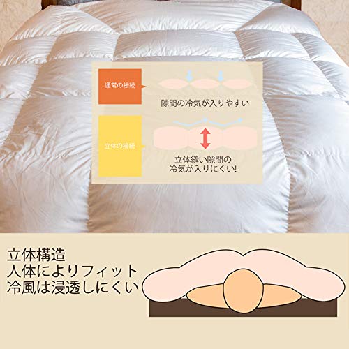 【Y字型デザイン】ユニークなY字型デザインを採用し、中央に85%のホワイトダックダウンを0.3kg、両側に50%のホ ワイトダックダウンを0.74kg充填します。真ん中がふわふわで、周りにちょうどよい圧迫感を与えて、体にぴったりフィット して寝冷えを防ぎます。