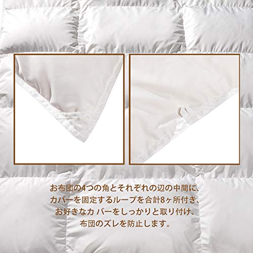 【暖かさを逃がさない】本体に3+3X4のキルティングを採用し、両側の縫い目を二重に施し、隙間からの冷たい空気 を防ぎます。また、お布団の4つの角とそれぞれの辺の中間に、カバーを固定するループを合計8ヶ所付き、お好きなカ バ一をしっかりと取り付け、布