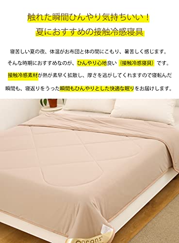 【素材】表面:触れるとひんやり感じる、接触冷感生地。暑くて寝苦しい日でも、快適な寝心地。肌触りひんやり、寝苦しい夜も心地よく眠りにつけるキルトケットです。