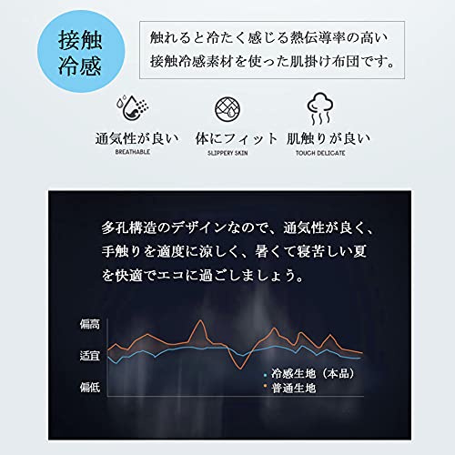 【接触冷感】冷感面は熱伝導率の高い接触冷感生地。肌が生地に触れると表面の熱が移動して、冷たさを感じます。寝返りなどで移動するたびに、体が接していない部分が放熱して温度が下がるので、朝まで心地良いひんやり感が持続します。エアコンと併用すれば、より冷たく感じます。
