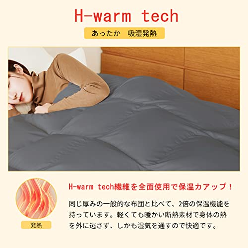1【H-warm tech素材】 サイズ:S,150210cm(シングル)総重量:2.2kg。H-warm tech繊維を全面使用で保温カアップ!同じ厚みの一般的な布団と比べて、保温性に優れている。軽くても暖かい断熱素材で身体の熱を外に逃さず、しかも湿気を通すので快適です。ふわふわした布団が快適な睡眠をお楽しみにいただけます。