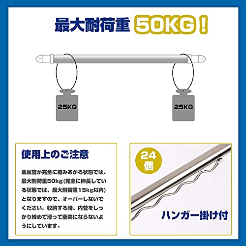【強力な物干し竿】つっぱり棒のパイプ径:外直径2.9cm 内直径2.5cm、鋼管の厚さは6 mmで、一般の物干し棒と比べ、より頑丈、型崩れもしにくく、最大耐荷重は50kgを達します。コートやジーンズなどの重いモノをたくさん干すご家庭でも安心に使えます。