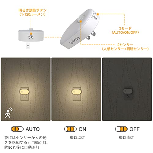 LEDセンサーライト 足元灯 常夜灯 ナイトライト LYRIDZ 無段階調節 人感 3つのモード コンセント式 電球色 省エ