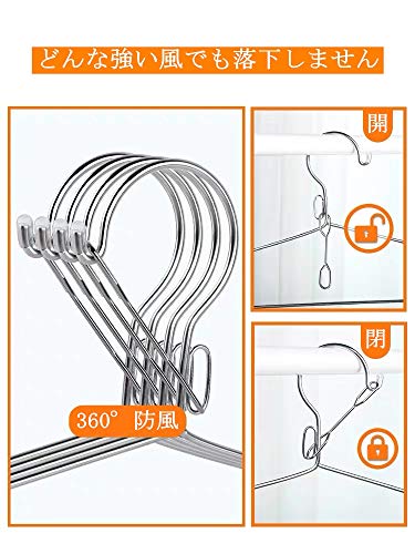 『品質&耐久』ハンガーは防風設計になっていて、フック部分はロック式なので、物干し竿をしっかり固定できます。サビにくいSUS304ステンレス鋼製、オールステンレスなので、耐久性が抜群で、標準サイズユニセックス幅約41cmX高さ約19cm、 1本辺りの厚さ:約3.2mm 重さ約60g耐荷重をさらにアップします、重めのアウターでも形が変わらずに収納できます。