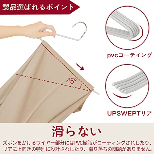 【滑らない加工&UPSWEPT REAR】ズボン ハンガーにゴムコーティングを施し、ズボンをすっきりと固定します。ズボン用ハンガーのコーティングは、衣服のしわを防ぐのにも役立ちます。特別に設計された上向きのリアは、滑り落ちの問題がありません。