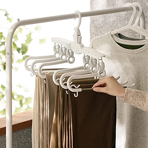【素敵なデザイン】普通のプラスチックズボンハンガーより、当製品の素晴らしいところは以下通りです。まずは当製品は折りたたみ可能です。クローゼットや押入れの空間を大幅に節約します。同じスペースでより多くな衣類を収納できます。超省スペースです。次は当製品は360度回転できます。ズボンを掛けることも取り出すことも便利です。更に毎段の掛け竿にクリップようなバックルがあります。安定性が高くてズボンが落とすことを心配いらないです。
