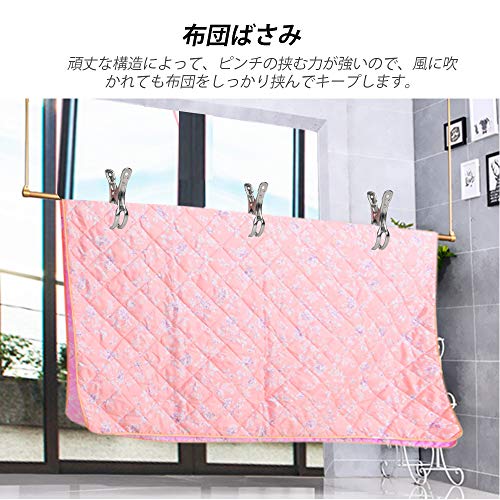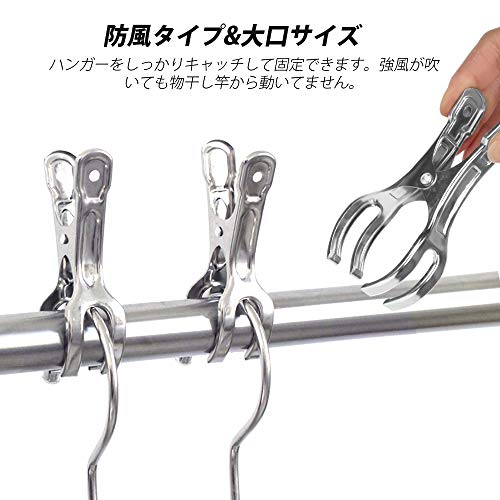 【物干し竿用ピンチ】:物干し竿もしっかりはさめる形状なので、ハンガーのかたより防止にも役に立ちます。ハンガーをしっかりキャッチして固定できます。強風が吹いても物干し竿から動いてません。布団ばさみとしても使えます。