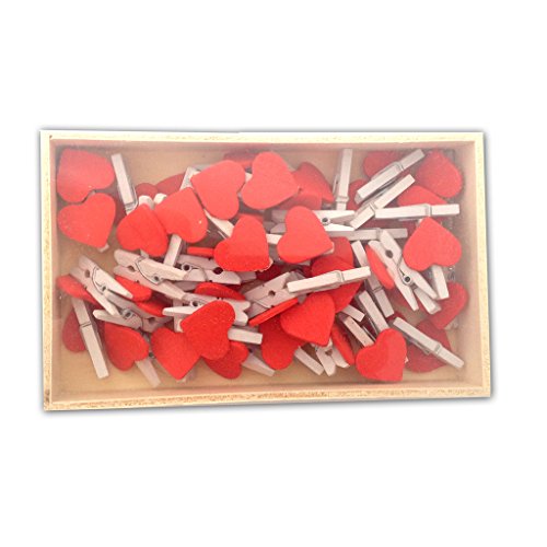 ミニ木箱の中に48個の素敵なミニ洗濯はさみを含むパッケージ、それぞれの洗濯挟みはそれに接着されている赤いハートで白い色です。