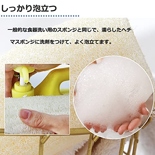 【しっかり泡立つ・お手入れも簡単】般的な食器洗い用のスポンジと同じで、濡らしたヘチマスポンジに洗剤をつけて、よく泡立てます。使い始めは固くて使いづらいかもしれませんが、1週間ほど使うと、なじんで泡立ちもよくなります。使い終わったヘチマスポンジは、水ですすぎ、しっかりと水気を切って乾燥させましょう。プラスチック製の一般的な食器洗い用スポンジと