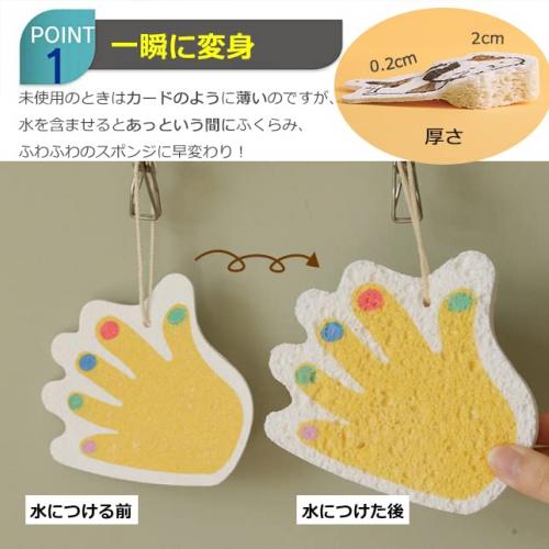 圧縮されたスポンジ。水に付ける前の時は薄いとソフトので、水につけてから、一気に膨らんでやわらくなります。天然素材だから、ガラスや漆器などのデリケートな素材も傷つけず、やさしく洗い上げることができて安心です。手に馴染みやすいサイズも使いやすいポイント。使い終わったらキュッと絞っておけば、乾きがはやく、雑菌の繁殖を防ぎます。カラカラに乾いて固くなりますが、水で濡らせばふわふわに戻ります。おもちゃになって、お風呂の時にも遊べるんです。