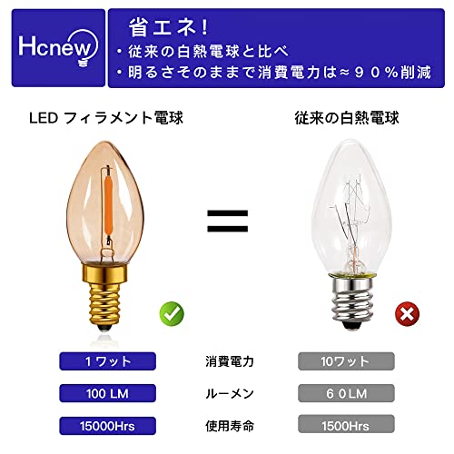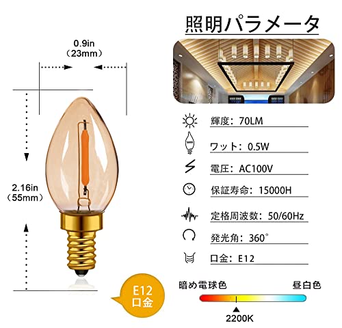 C7G 電球LEDライト:電圧:100V、電力:0.5W、Supre Warm 2200K、ゴールデンのガラス、 口金:E12 サイズ:2255MM