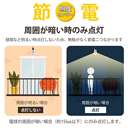 【人感センサー付き自動点灯/消灯、省エネ】ikasus LED電球は光センサーと人感センサーが搭載で昼間や明るい場所でに自動に消灯します。夜に真っ暗くなると、人の動きを感知し自動で点灯します。人が近づくとパッと自動点灯し、離れると約40-60秒後に消灯。省エネのLEDを採用し、安全性が高くて、従来の白熱電球と比べ、消費電力は約85%を削減できます!