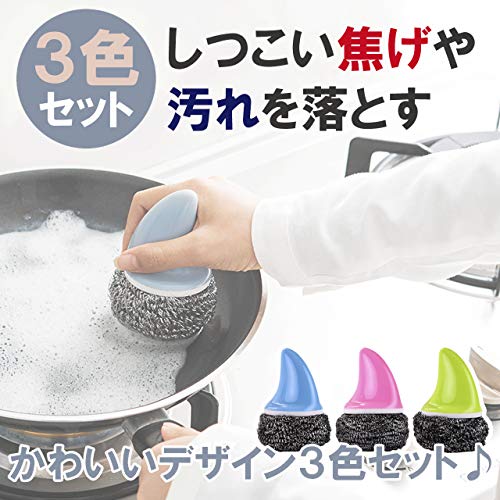 HAMILO ステンレスたわし 金属たわし キッチン コゲ 汚れ落とし 磨きやすい 3個セット (グリーン×ブルー×ピン
