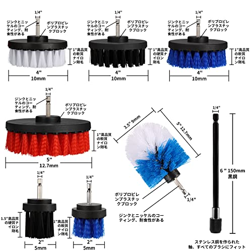 セット内容:フラットブラシx6、砲弾型ブラシx1、研磨パッドx12、スクラブスポンジx2、スクラブコネクターx1、延長ロッドx1(ご注意:セットには電動ドリルが含まれない)。