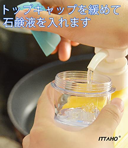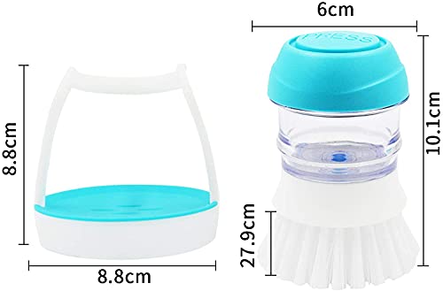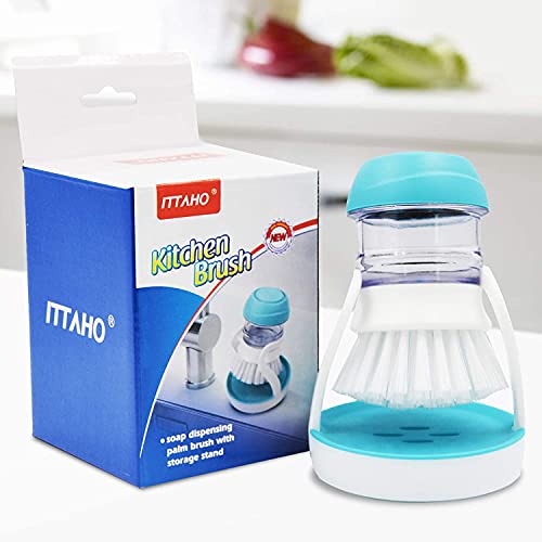 ITTAHO ソープ ディスペンシング パーム ブラシ: スクラバーは詰め替え可能なソープ ディスペンサーに取り付けられています。上部を押すと、食器用石鹸または洗剤が取り出され、掃除が始まります。食器、鍋、フライパン、調理器具、シンクの掃除だけでなく、自動車、車、エンジン、バイクの掃除にも使えます。すべての家族に 1 つのマルチユース クリーニング ブラシ。