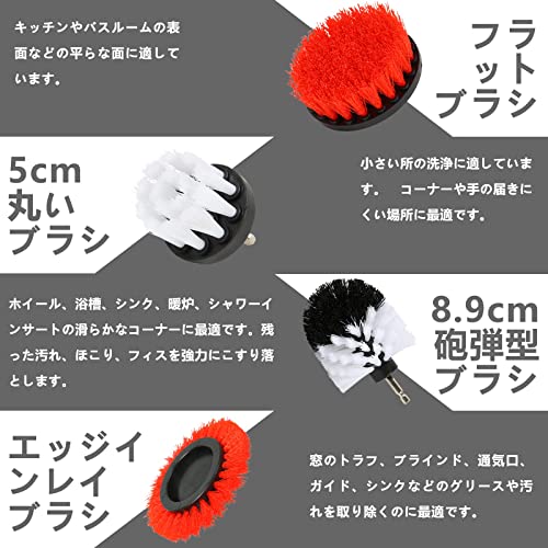 セット内容:フラットブラシx2、エッジブラシx1、砲弾型ブラシx1、延長ロッドx1(ご注意:本製品にはドリルが含まれていません)。