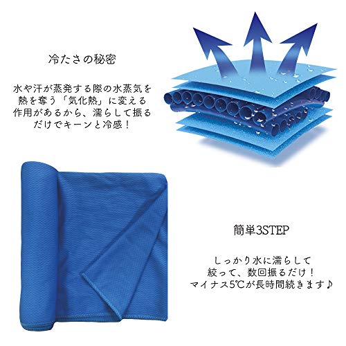 ?冷たさの秘密、水や汗が蒸発する際の水蒸気を 熱を奪う「気化熱」に変える 作用があるから、濡らして振る だけでキーンと冷感!簡単3STEP、しっかり水に濡らして 絞って