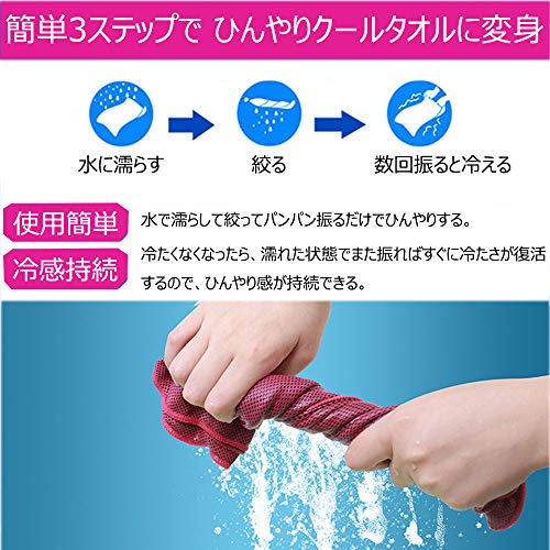 【冷却効果高い】振ると冷える繰り返して使える冷感タオル。水で濡らして絞ってパンパン振るだけでひんやり涼しい。ひんやり感がなくなったら、まだ濡れた状態で振れば何度も冷たくなり、冷感が持続できる。夏の炎天下の中、体感温度を下げるのに役に立ちます。真夏の暑さ対策、熱中症対策グッズとして大活躍。
