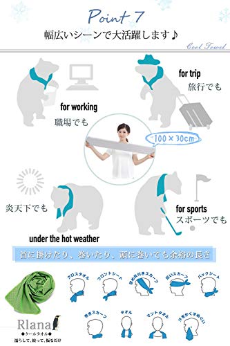 ?「クールタオル|ひんやりタオル?急速低温・超冷感タオル」冷感を保つ素材を含んだ繊維を使用しております。熱がこもりにくく、熱を素早く発散する特性があります。タオルを完全に水で濡らして、瞬間に涼しくなる冷感タオル♪冷却効果が高い、肌に当てれば即効ヒンヤリ!1~4時間は冷感が持続します。偽物にご注意!該当商品の正規販売店はRLANAのみです。弊社のクールタオルは軽量の冷感竹繊維素材を採用して、サイズは30cm×100cm(偽物は安いの繊維素材、30cm×90cm)。丁寧な包装と保証書も付属しております。RLANAの模倣品や偽物が出回っております。必ず出品元をご確認ください。