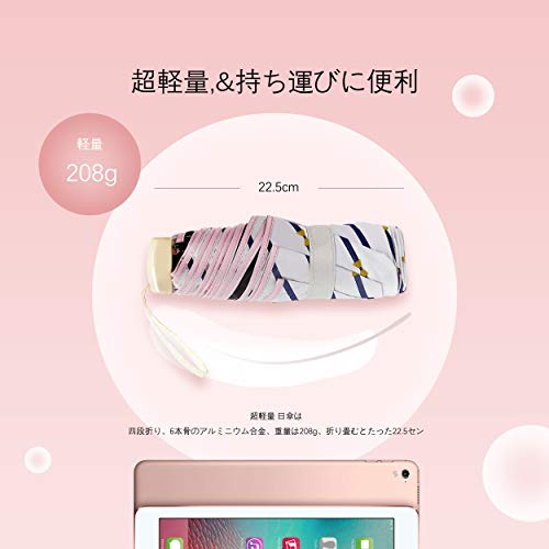 【超軽量・便利】 この超軽量 日傘は四段折り、6本骨のアルミニウム合金、重量は208g、折り畳むとたった22.5センチで収納ケースも付いてあるのでかばんに常備しておき、手荷物がある時でもスマートに対応。
