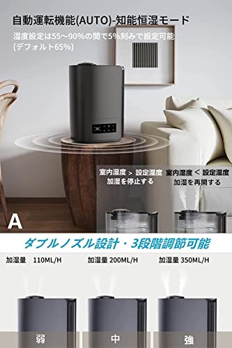 【知能恒湿システム・上部給水タイプ】6L大容量水タンク付、最大加湿量は約350ml/hとハイパワー!最大60時間連続加湿可能。知能恒湿システム搭載、センサーが湿度を感知して自動調節、湿度は55~90%の8段階で設定可能(5%刻み)。上部給水方式、噴出口下のグリル穴から水を注げます!