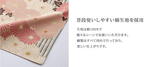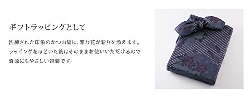 50cm角の小風呂敷です。落ち着いた色合いで、かつお縞に牡丹と菊が描かれたデザインは、華やかさと上品さを兼ね揃えております。旅行時荷物を分ける際に使うのはもちろん、ハンカチとしてお使いいただいたり。お弁当包みに使ったり。棚やテーブルの敷物にしたり、額に入れてお部屋のインテリアに使ったり。風呂敷として、小さいものを包むラッピングアイテムとしてもお使いいただけます。