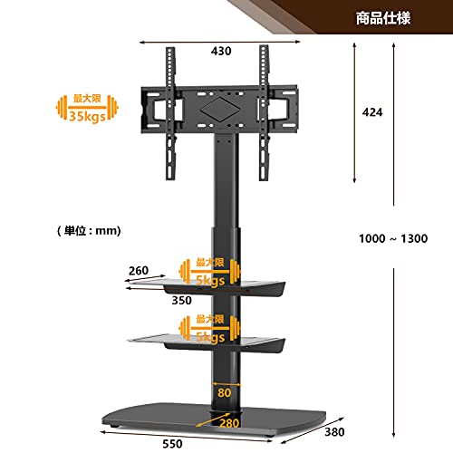 【安全&安定】耐荷重:35kg 頑丈な鉄及び厚い強化ガラスベースで作られています。強化ガラスの衝撃強度、安全性は普通のガラスの何倍もあります。テレビスタンドの底に滑り止めのゴムパッドも付いて、テレビの落下防止するために安全ロックもあり、安定性が優れます。