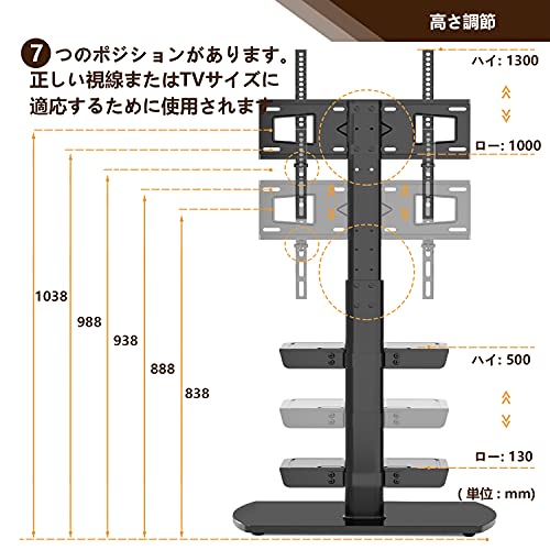 【ラック回転・高さ調節】最適な視角及びより良い視聴効果を得るために、tvスタンドのラックが左右30°回転でき、高さも1000 mmから1300 mm(6段階)まで調整可能です。 3段の棚板の高さも自由に調整でき、AV機器と小物など置けるので便